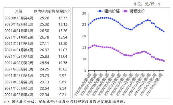 生猪价格明显下跌,饲料价格持续上涨,养殖收益继续下降。据农业农村部监测,3月份,猪粮比价9.60:1,比上月下降1.01个点。3月份,全国饲用玉米价格每公斤2.99元,环比涨1.4%,同比涨41.0%;育肥猪配合饲料价格每公斤3.62元,环比涨0.3%,同比涨16.0%。从全国平均水平看,自繁自养的生猪养殖利润每头1867元,环比减12.0%,同比减37.4%;外购仔猪的生猪养殖利润每头530元,环比减37.8%,同比减60.7%。