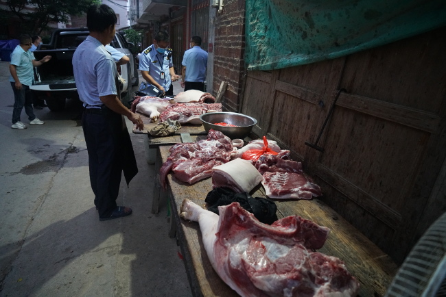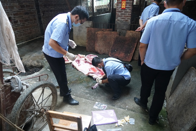 日前,梧州市农业综合行政执法支队与梧州市公安局万秀区分局组成联合执法队,在夏郢镇开展打击生猪私屠滥宰违法行为专项行动,确保国庆节和党的二十大期间肉食品安全。