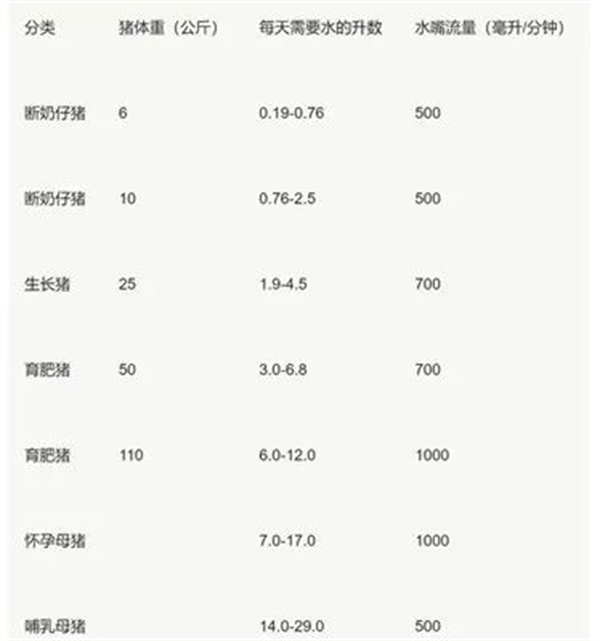 猪的日龄、阶段、气温变化以及饲料类型都会对猪群的饮水量产生影响,通常计算猪的饮水量需要通过采食量进行换算,一般猪饮水量和采食量的比例为2.5-3,而猪的采食量又可以根据体重换算,保育猪的采食量为体重的4-5%,育肥猪的采食量为体重的3-4%,所以正常情况下猪每天的饮水量为体重的10-15%,但因为哺乳母猪需要提供奶水所以饮水量更大,可达到20kg/天甚至更高,具体各日龄的饮水量可参考下表:
