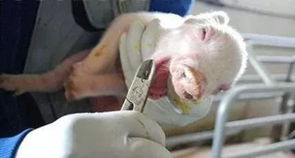 仔猪吸到初乳24小时(最少6小时)后,剪掉上下颚8颗牙齿,确保剪平且不伤到牙龈;