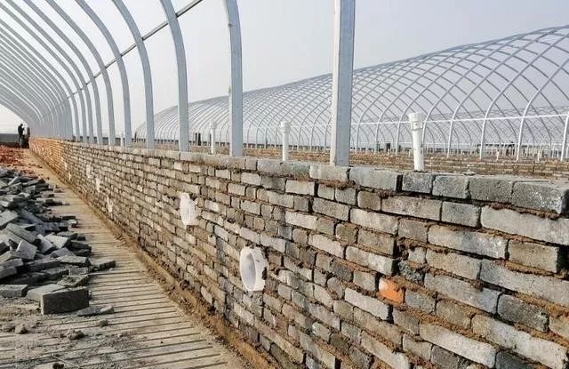 大棚宜建在地势高燥、水泥、电源充足的地方。首先平整场地,划线。挖地槽,铺基石,砌砖墙。大棚跨度一般为4~5米,长度20—25米,四周围栏高1~1.2米。空心砖共砌五层,中间一层每隔一块倒砌一块,空心向外,以利夏天通风,冬天用泥土堵住保暖。四周立12根立柱,两侧各5根,对称垒建,高1.7~1.9米,栏底至顶棚高2.7~3.0米。