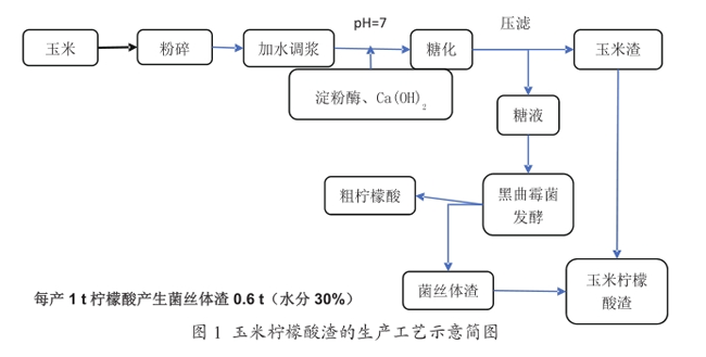 以玉米为原料发酵生产柠檬酸是目前世界上生产柠檬酸的主要方法之一。玉米经粉碎后加水调浆,然后加入淀粉酶和糖化酶进行酶解,随后分离出玉米渣和糖液,糖液被用于进一步发酵生产柠檬酸,在这个过程中会产生部分菌丝体渣(发酵滤渣)。将分离出来的玉米渣和发酵滤渣按一定比例混合干燥后即得到玉米柠檬酸渣。玉米柠檬酸渣的生产工艺可简单概括如(图1)。
