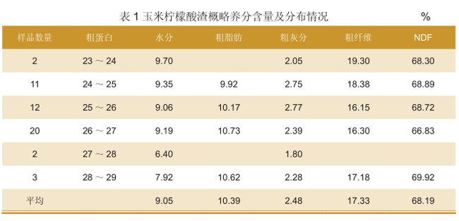 统计分析同一工厂50个批次柠檬酸渣样品的概略养分检测结果可以看出:玉米柠檬酸渣的粗蛋白和脂肪含量高,且含量较为稳定(蛋白24%~29%,大多数样品的蛋白含量在26.5%左右,脂肪含量在10%左右),粗纤维和NDF的含量变异也较小(粗纤维为16%~20%,NDF为66%~70%)(表1)。