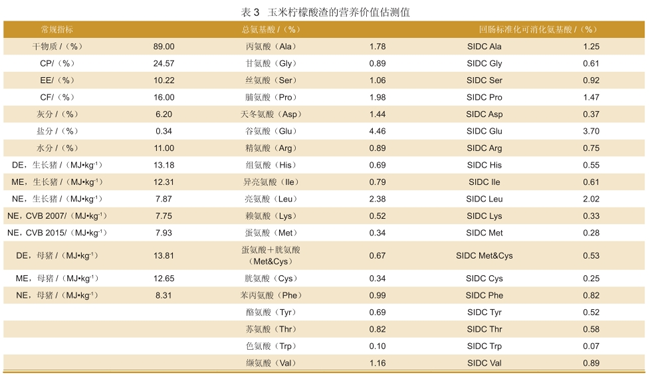 玉米柠檬酸渣适口性好,蛋白和脂肪含量高,是一种非常有营养价值的猪料原料。由于原料中还残留有部分柠檬酸(约3%~5%),因此在配方中大量使用时还能起到部分酸化剂的效果。然而,要在猪料配方中用好该原料仍然面临着许多问题。比如,不同厂家不同批次原料营养价值的稳定性问题,在配方中的适宜添加水平问题,原料有效能值及氨基酸消化率等仍然缺乏实测数据的支撑。在实际使用过程中,都是借助原料的相似性对能值和氨基酸可利用率进行估计。表3给出了玉米柠檬酸渣有效能值及可消化氨基酸含量的估计值。按表3所给出的数值,在配方中添加高达8%的玉米柠檬酸渣也不会对猪的生产性能产生负面影响。