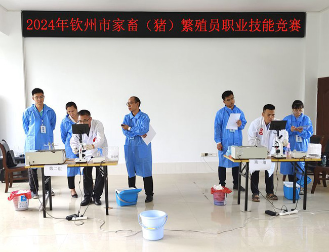 竞赛汇集了钦州市各县(区)4支优秀代表队、市畜牧站共21名选手同台竞技,竞赛内容涵盖了家畜繁殖的理论知识考核、现场技能操作等多个方面,其中现场技能操作竞赛包括猪常温精液精子活力和密度检测等。