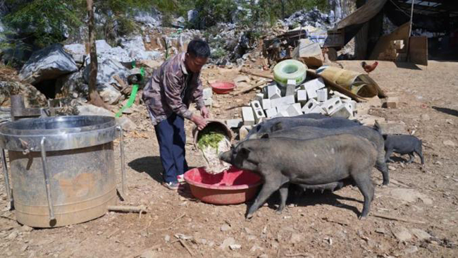 当樊慧科和妻子准备好吃食后,装满食物的桶对野山猪来说就是一个“开饭”信号,一群野山猪开始出现在眼前。从眼前的盆到另外一个盆,野山猪总是四处“光顾”。“一天喂两次,玉米、玉米杆都拿来配料,猪在外面活动的时候就吃树叶。”樊慧科边忙碌边说。