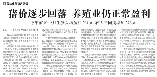 今年8~10月份的新生仔猪数量虽然比去年同期减少1.6%,但已处于近年来的较高水平,按6个月育肥周期计算,2025年春节后消费淡季猪肉阶段性供给过剩的可能性增加,生猪养殖大概率将出现微利甚至亏损。据监测,10月份全国新生仔猪数量环比下降0.1%,其中规模猪场环比下降1.2%。同时,大型猪企持续提高生产效率,不断降低生产成本,一些企业每公斤生猪成本已降至14元以下,较年初降低1~2元。