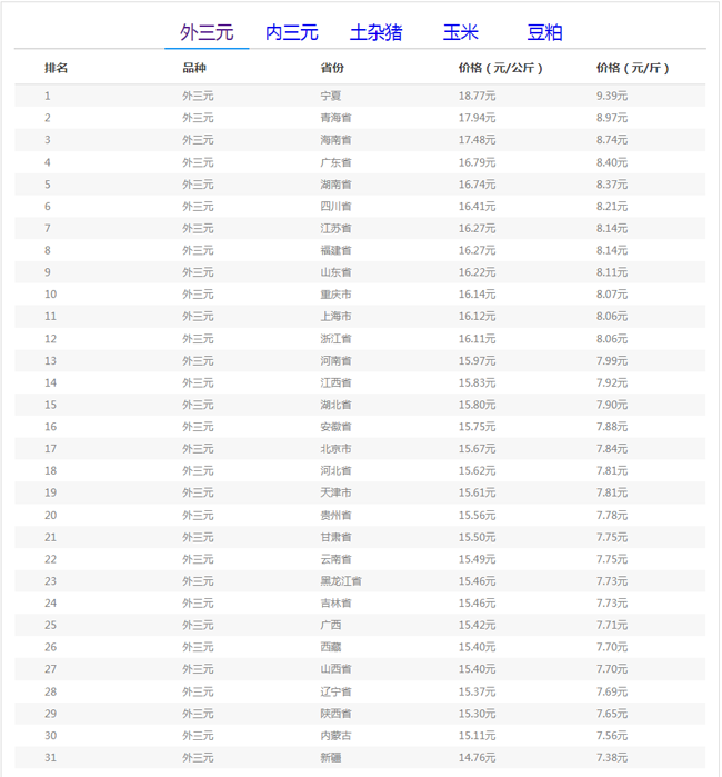 图:2024年12月06日-中国养猪网全国外三元生猪价格排行榜
