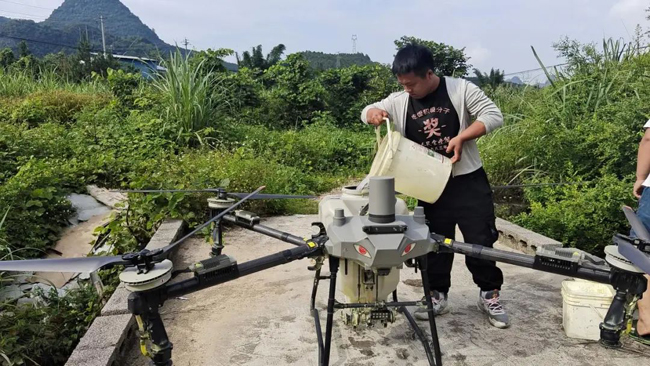 新农人正在给无人机加注液态肥