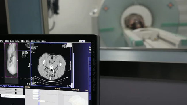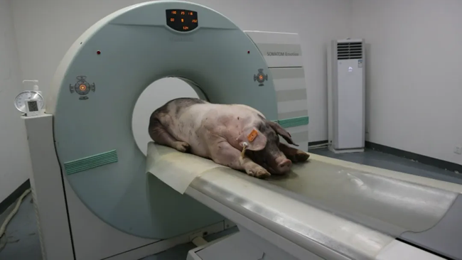贵港史记核心种猪场坐落在覃塘区樟木镇中周村的一处山林里。这里奇特有趣的一幕正在上演:一头猪躺在CT扫描设备上,扫描之后能生成四五百张图片,技术员通过软件处理,计算出它身上的肌肉、脂肪、骨头含量等。