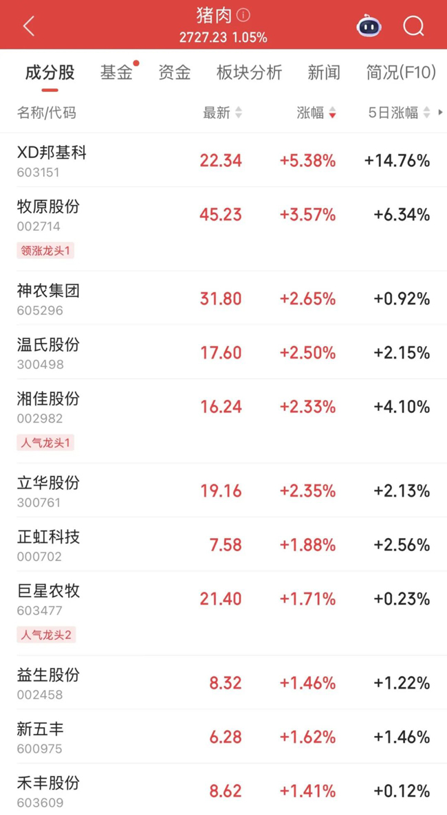 7月9日,A股生猪养殖板块集体飘红!XD邦基科、神农集团、牧原股份、东瑞股份、温氏股份等个股涨幅居前。板块指数单日涨幅达3.5%,一扫此前颓势。