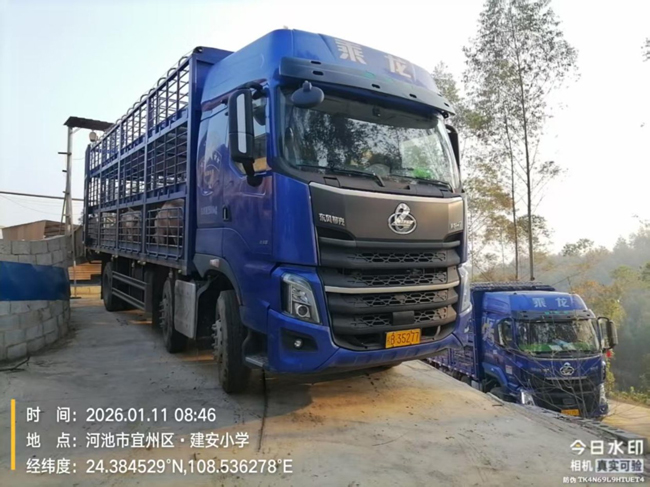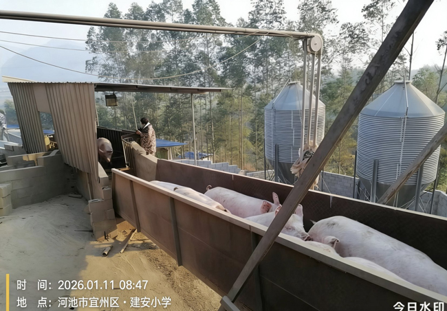 2026年1月11日清晨,河池市宜州区北山镇建安村板另屯的玉金富裕家庭农场内一片繁忙,工人们正有条不紊地将育肥生猪赶运装车,这是该农场2026年新春迎来的首批生猪出栏,标志着宜州区家庭农场生猪养殖产业实现新年“开门红”。