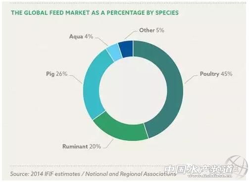 全球饲料品种分类:(水产养殖饲料4%;猪饲料26%;反刍动物饲料20%;家禽饲料45%,其它5%);以上数据来源:2014年IFIF预计/国家和地区联盟