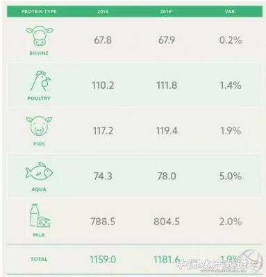 全球蛋白产量 2014/2015 单位:百万公吨