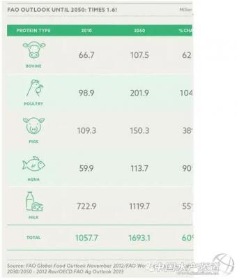 根据联合国粮农组织(FAO)测算,到2050年,全球食品需求将上涨60%,在2010年到2050年期间,动物蛋白的需求将每年增长约1.7%,而肉制品增长约70%,水产养殖产量增长90%,乳制品增长55%。这已经标志着经济增长了几乎两倍,但如果按照前40年的增长速度推算,至2050年,总需求将会增长近4倍。