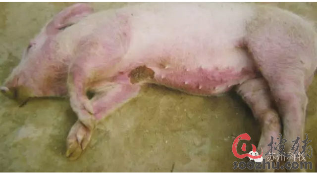隔离病重猪并进行注射治疗。大群猪只采用苏州科牧磺莎啉(主要成分为磺胺氯哒嗪钠和甲氧苄啶)拌料,每千克本品拌料一吨,连用5~7天,孕畜可用。