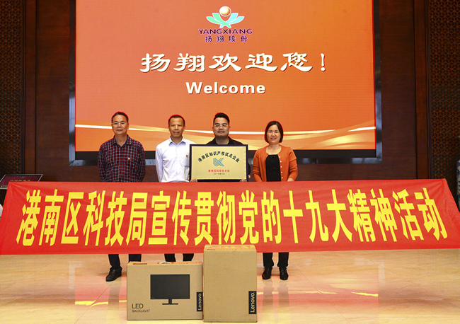 近日,港南区科学技术局以举办“宣传贯彻党的十九大精神”活动为契机,局长周景勇、副局长陆庆娟一行,到广西扬翔股份有限公司,为公司授以港南区知识产权试点企业牌匾。