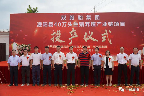 8月11日上午,灌阳县双胞胎集团“40万头生猪养殖全产业链项目”投产仪式在灌阳县新圩镇平田村双胞胎猪场内举行。县委书记周春涌,县长卢嵩,县委常委、统战部部长赵桂花,县委常委、县委办主任唐奕,县人大常委会副主任赵新春,副县长唐敏,县直有关单位、新圩镇相关领导,双胞胎(集团)股份有限公司有关负责人等出席投产仪式。